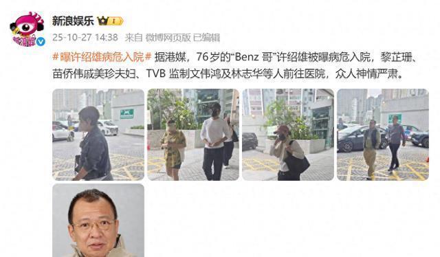 据@新浪文娱27日音讯,76岁的“Benz哥”许绍雄被曝病危住院,黎芷珊、苗侨伟戚好意思珍配偶、TVB监制文伟鸿及林志华等东说念主赶赴病院,世东说念主心扉严肃。