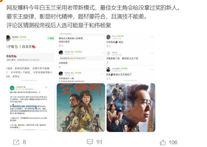 从白玉兰官方发出的音信上看,本年的授奖典礼将于6月22日至26日举办。近日,网上传出一条音信,白玉兰评奖将取舍“新方法”,这么的情况出现,最好女主边界直禁受缩,这是若何回事呢?