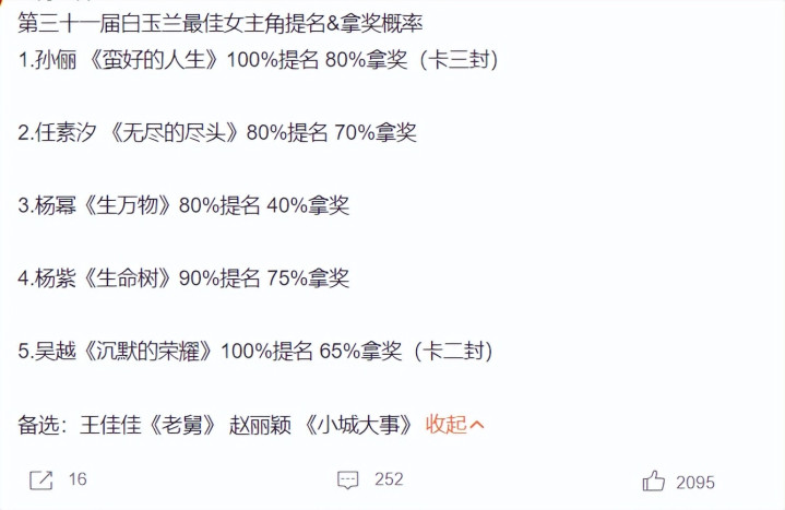 咱们王人知说念,每年的白玉兰最好女主角竞争王人卓绝浓烈,但比较于前几届,本季的竞争更为浓烈,因为多位女演员王人拿出高质地作品,但入围的只会有五个东说念主。