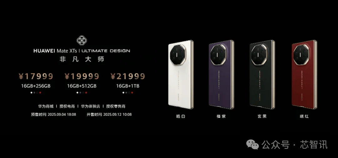 Mate XTs提供黑、红、白、紫等配色,16GB+256GB版块17999元,16GB+512GB版块19999元,16GB+1TB版块21999元,这三个版块比较前代均低廉了2000元。