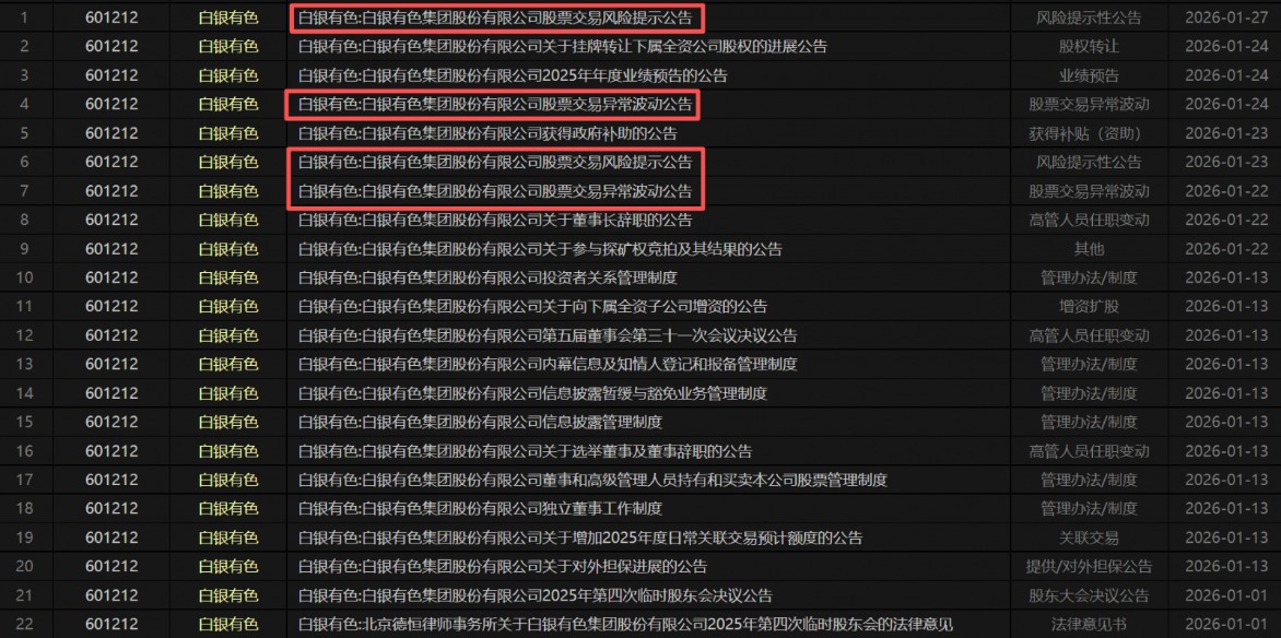 1月下旬,这家顶着“白银”名号的有色金属企业密集发布股票来回特别波动公告及风险辅导。