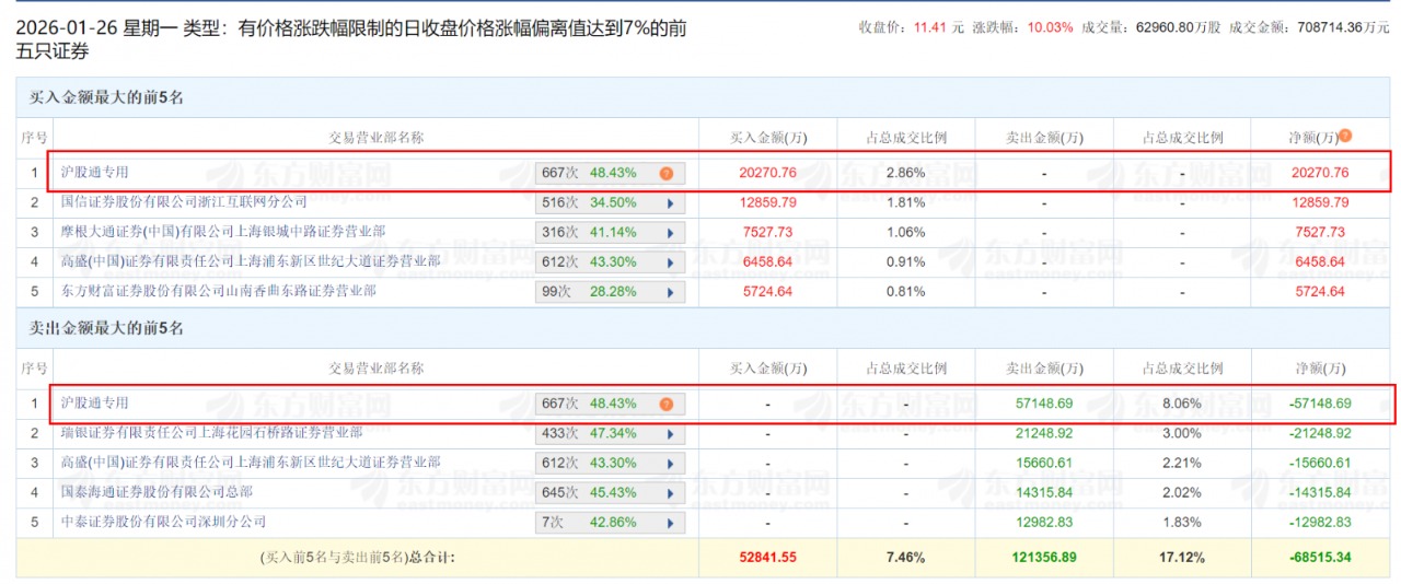 从资金面来看,这场连板行情背后的博弈也日趋强烈,1月26日龙虎榜数据知晓,沪股通专用席位净卖出57148.69万元,净买入仅20270.76万元,且量化基金同期现身商业两边,呈现“傍边互搏”态势,外资与机构间不合显耀,部分主力资金借涨停板出货迹象明显,进一步突显了股价上升的脆弱性。