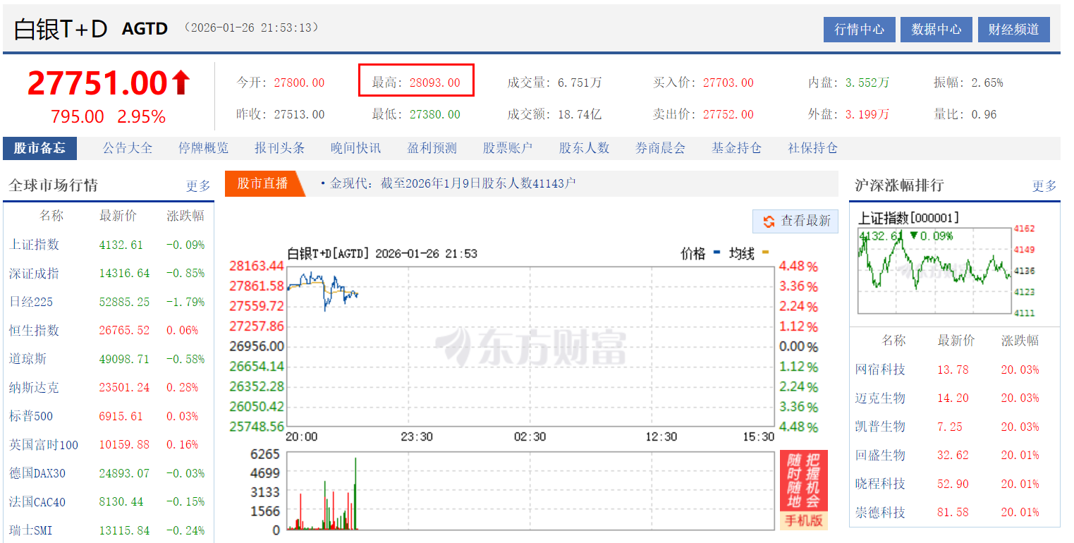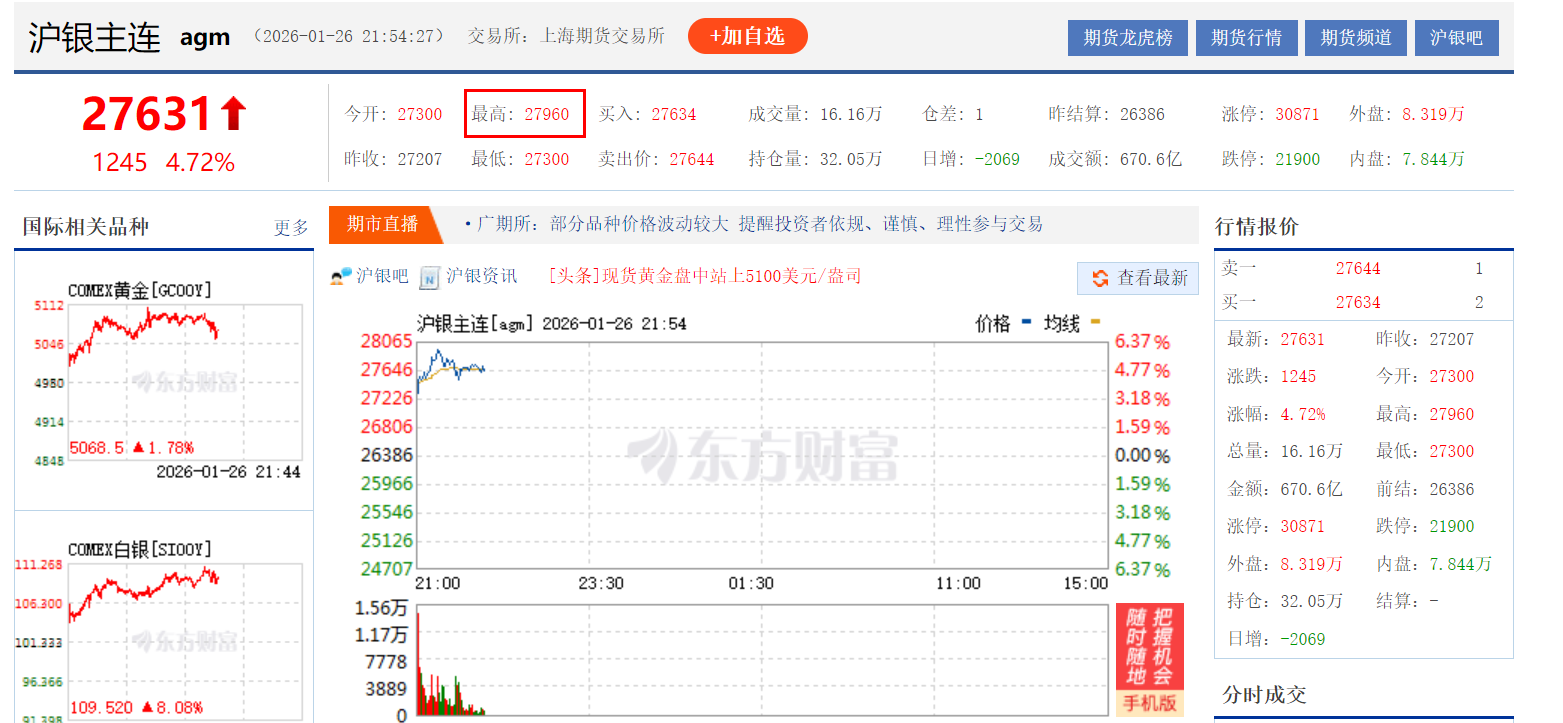 戒指1月26日,内行贵金属商场呈现全面爆发态势,伦敦银(XAG)价钱艰涩110好意思元/盎司,戒指记者发稿,盘中涨幅达6.21%。国内商场上,白银T+D(AGTD)价钱最高涉及28093元/千克,戒指记者发稿,盘中涨幅达2.95%。沪银主连(agm)价钱最高涉及27960元/千克,戒指记者发稿,盘中涨幅达4.72%,创下阶段性新高。