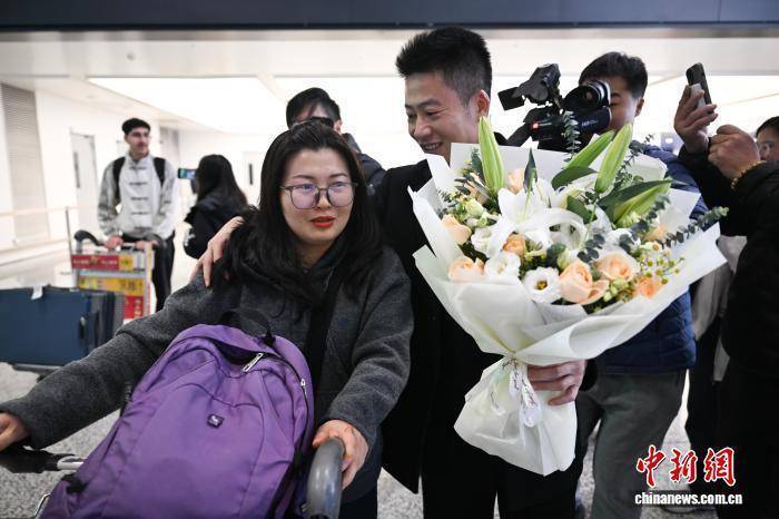 3月8日,从迪拜复返的游客(左)被暖热迎接。当日,迪拜至杭州航路慎重复航,数百名远在中东的同族乘坐EK310航班从迪拜复返浙江杭州。中新社记者 王刚 摄