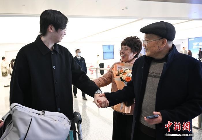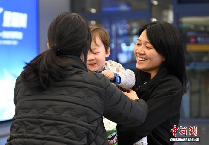 3月8日,周女士(右)带着孩子从迪拜复返杭州,家东谈主暖热迎接。当日,迪拜至杭州航路慎重复航,数百名远在中东的同族乘坐EK310航班从迪拜复返浙江杭州。中新社记者 王刚 摄