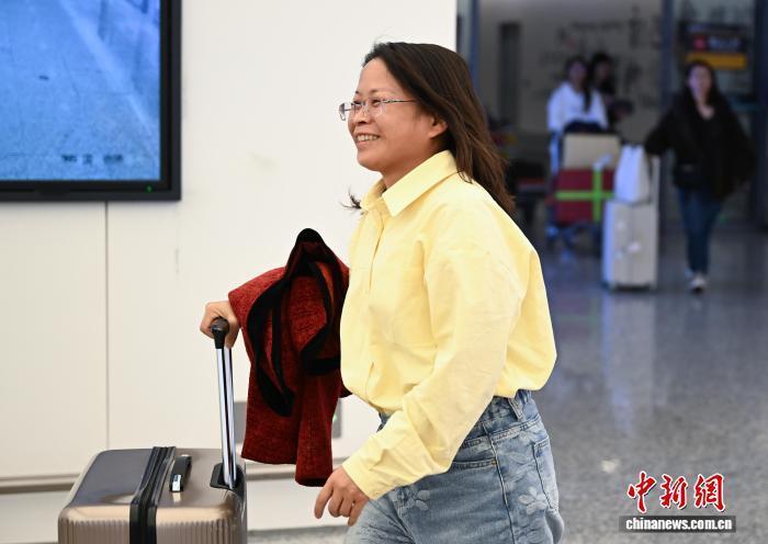 3月8日,EK310游客欣喜走出杭州机场。当日,迪拜至杭州航路慎重复航,数百名远在中东的同族乘坐EK310航班从迪拜复返浙江杭州。中新社记者 王刚 摄