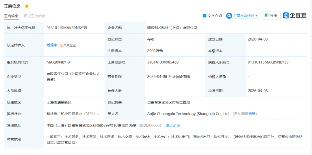 从注册信息来看,翱捷创芯的注册地址坐落于上海张江,与翱捷科技总部同处一幢楼宇,这一布局并非随机。